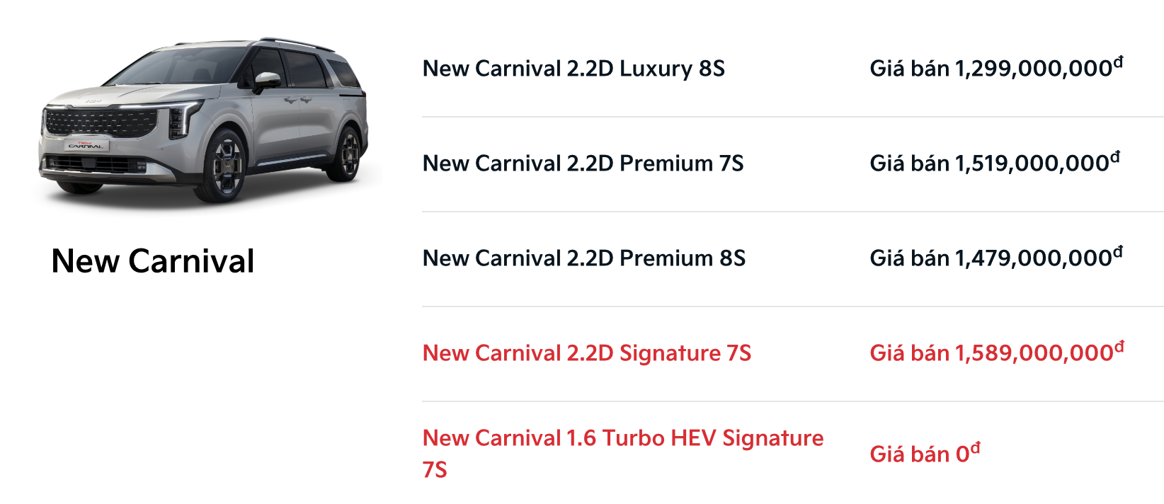 Kia Carnival 2025 tại Việt Nam sắp thêm phiên bản hybrid. Trên website của Kia Việt Nam đã "nhá hàng" thông tin sớm về phiên bản Carnival mới này. Tên đầy đủ của phiên bản này là Carnival 1.6 Turbo HEV Signature 7S.