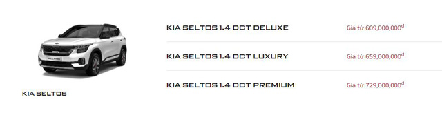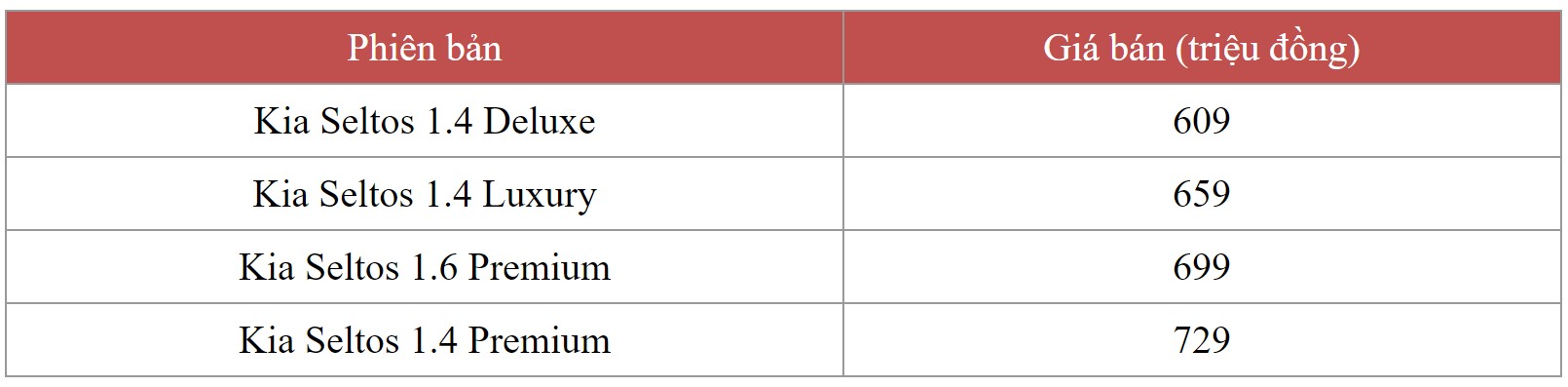 Theo định kỳ điều chỉnh giá hàng tháng, Kia Việt Nam vừa thay đổi mức niêm yết của nhiều dòng xe đang phân phối trong nước, trong đó đáng chú ý có Seltos. Cụ thể, tất cả phiên bản của dòng xe này bao gồm 1.4 Deluxe, 1.4 Luxury và 1.4 Premium đều tăng giá 10 triệu đồng. Bản 1.6 Premium không được đề cập trên trang chủ nhưng tư vấn bán hàng cho biết cũng có mức tăng giá tương tự. Như vậy, mức giá khởi điểm của Kia Seltos tăng từ 599 triệu đồng lên 609 triệu đồng.