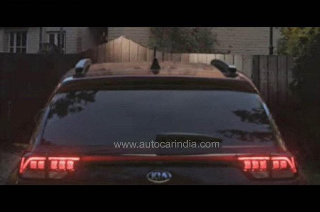Các đèn đuôi được kết nối bởi một dải phản chiếu mỏng, thay thế cho thanh ánh sáng LED nhìn thấy trên chiếc xe trưng bày. Phía bên dưới có logo của Kia.