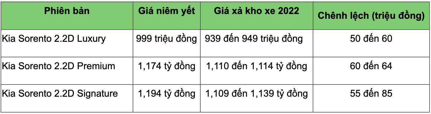 Những chiếc Kia Sorento phiên bản máy dầu, sản xuất năm 2022 đang được đại lý giảm giá từ 50 đến 85 triệu đồng tùy cấu hình xe. Cụ thể, một số đại lý kinh doanh xe Kia chính hãng tại Việt Nam đang đưa ra chương trình giảm giá riêng, áp dụng cho mẫu xe Kia Sorento bản máy dầu 2.2D với năm sản xuất 2022. Những bản được giảm bao gồm 2.2D Luxury, 2.2D Premium và 2.2D Signature.