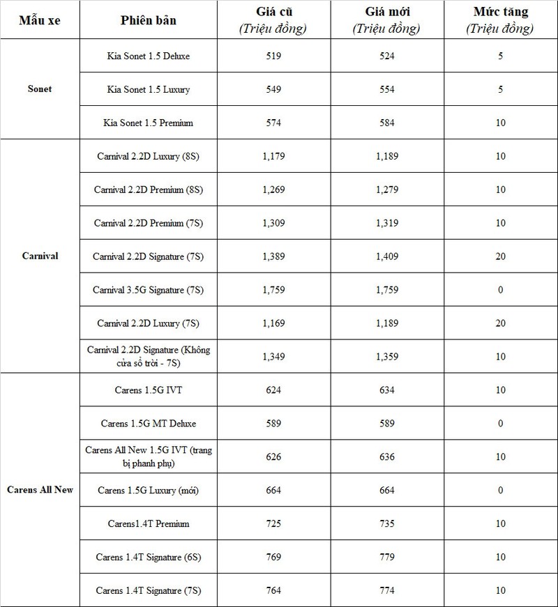 Giá xe Kia Carnival tăng từ 10 – 20 triệu đồng. Cụ thể các phiên bản bản Luxury, Premium (8S) và Premium (7S) 2.2D Signature (Không cửa sổ trời - 7S) tăng giá 10 triệu đồng. Hai phiên bản Signature (7S) và Luxury (7S) có giá bán cao hơn trước 20 triệu đồng, riêng bản máy xăng 3.5 giữ nguyên giá bán 1,759 tỷ đồng.