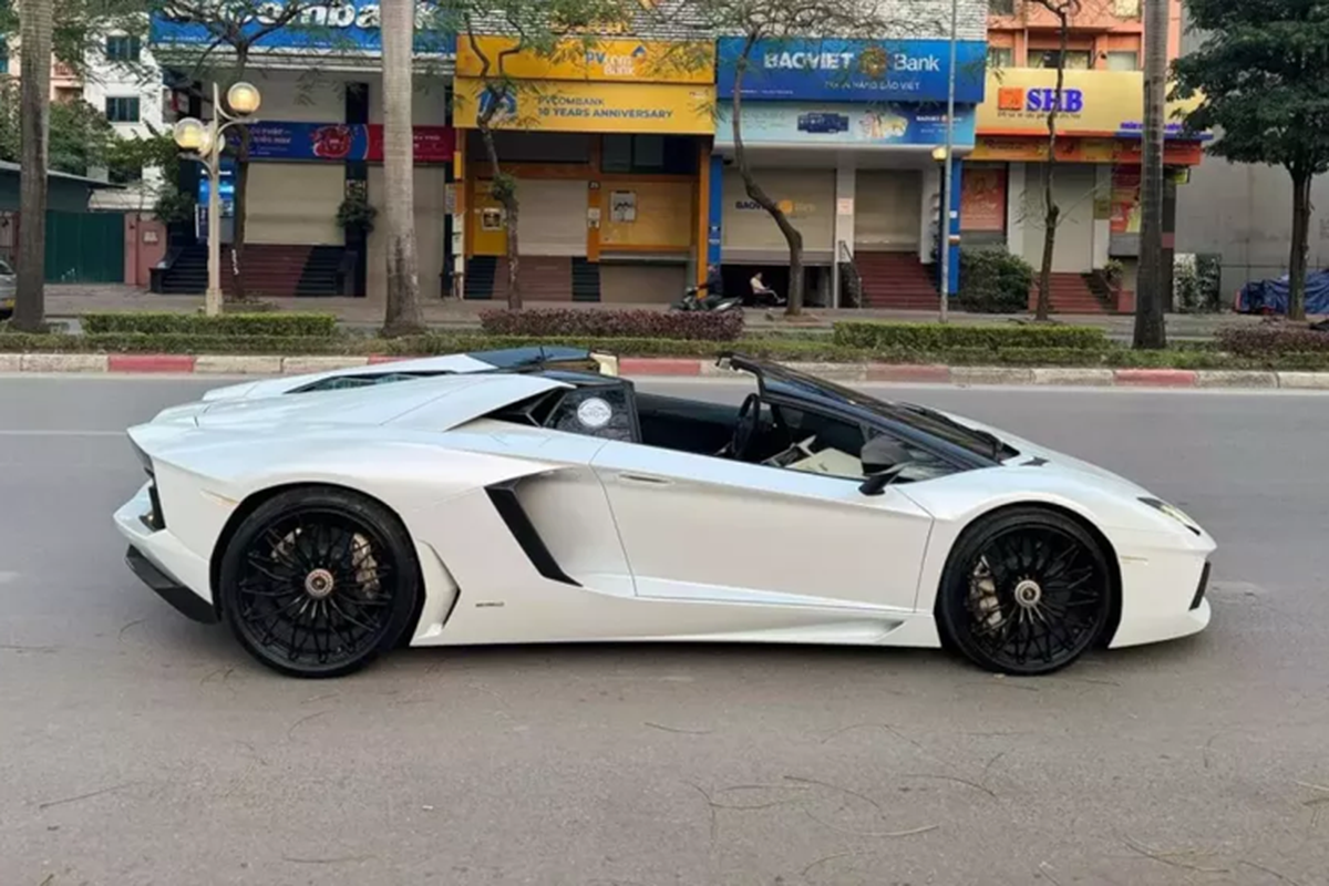 Chiếc xe Lamborghini Aventador LP700-4 Roadster này hiện mang màu trắng, kết hợp mui màu đen và bộ mâm độ đa chấu kép... và đang được chủ nhân chào bán với mức giá khoảng 17 tỷ tại Hà Nội.