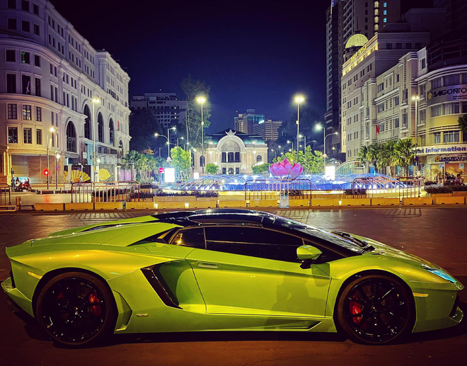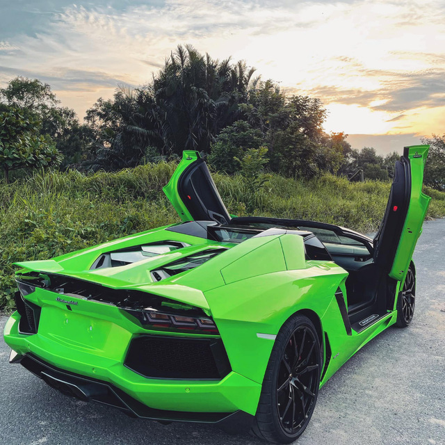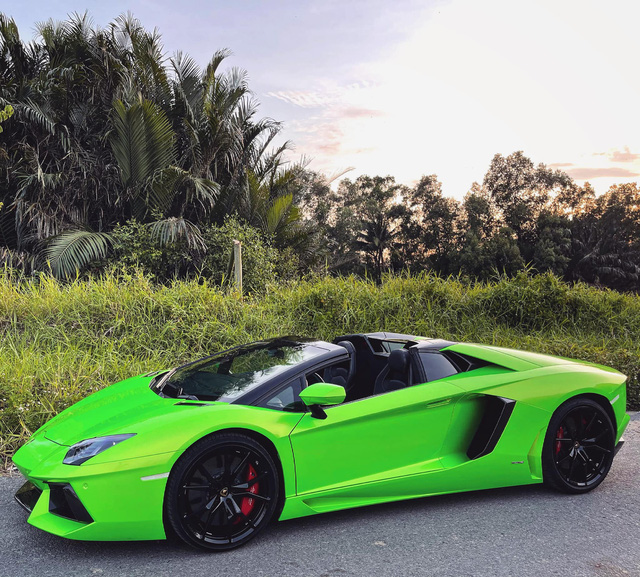 Về phần chiếc Lamborghini Aventador Roadster bị mất kính gương chiếu hậu, đây là chiếc Aventador LP 700-4 thứ tư về Việt Nam. Xe từng thuộc sở hữu của một doanh nhân kinh doanh hoa lan tại Bình Phước, trước khi được rao bán lại. Nguyên bản, xe sở hữu lớp sơn màu trắng nhưng đã được khoác lên lớp decal màu xanh lá. Bộ mâm 5 chấu kép sơn đen kết hợp cùng cùm phanh màu đỏ ẩn ở phía sau.