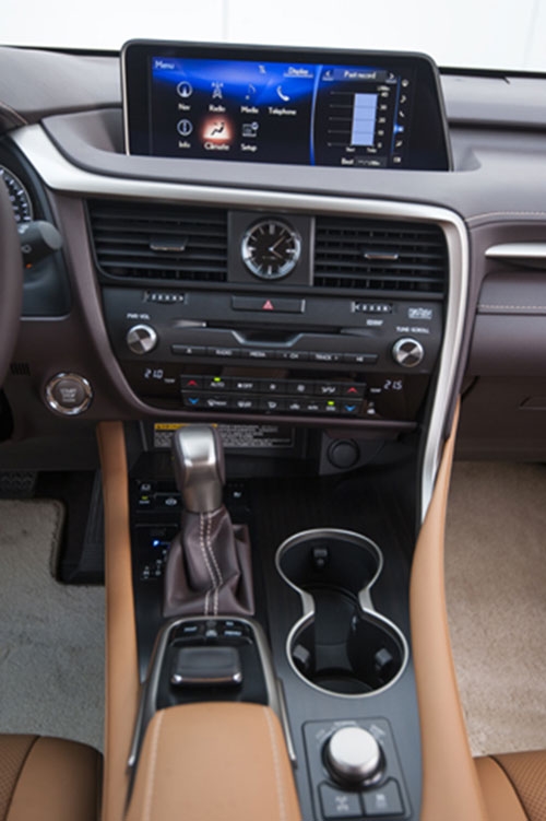 Lexus trang bị cho RX 2016 kiểm soát hành trình với radar, cảm biến lùi, hỗ trợ đỗ xe, camera toàn cảnh, đèn pha thích ứng, cảnh báo điểm bù, cảnh báo chệch làn. Mở cửa cốp xe không cần chạm, bằng cách đặt bàn tay gần logo Lexus ở phía sau.