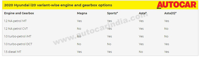 Hyundai i20 mới có biến thể cơ sở Magna sử dụng động cơ xăng 1.2 và 1.5 diesel và chỉ kết hợp cùng hộp số sàn. Các lựa chọn mở rộng sẽ xuất hiện trên biến thể Hyundai i20 Sportz. Sportz sẽ có sẵn với cả ba tùy chọn động cơ, cũng như tùy chọn hộp số tay, CVT và iMT.