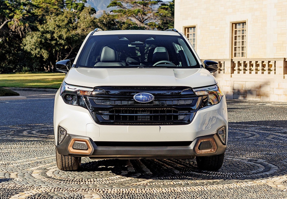 Ngoại thất Subaru Forester 2024 giữ lại bộ khung tổng thể cũ đi kèm bộ mặt mới giống... Ford Explorer. Tản nhiệt rộng hơn, đèn pha cải tiến đi kèm đèn LED ban ngày mảnh mai hơn, thêm ốp nhựa tại cản trước và đèn sương mù hốc hình tam giác là một số điểm nhấn chính.