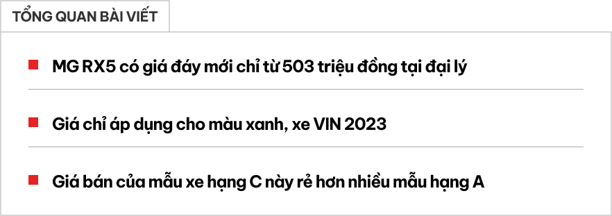 Theo thông tin từ một số tư vấn bán hàng đại lý MG phía Bắc, MG RX5 đang được giảm giá còn khoảng hơn 500 triệu đồng. Có nơi chào bán với giá chỉ 503 triệu đồng, trong khi đại lý khác đưa ra giá cao hơn 10 triệu, ở mức 513 triệu đồng. Giá xe không đồng nhất do chính sách mỗi đại lý khác nhau. Đây không phải khuyến mãi chính hãng.