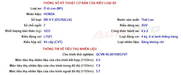 Cũng theo thông tin từ Cục Đăng kiểm, mức tiêu thụ nhiên liệu trung bình trong điều kiện hỗn hợp của Honda BR-V là 6,5 lít/100km. Trong điều kiện đường phố và đường trường, xe tiêu thụ lần lượt 7,9 lít/100 km và 5,7 lít/100km. Đây là số liệu do Cục đo tại Việt Nam. Trong khi đó, số liệu về lượng nhiên liệu tiêu thụ của đối thủ Mitsubishi Xpander ở các điều kiện đường phố, đường trường và hỗn hợp lần lượt là 7,6 lít, 5,4 lít và 6,2 lít/100 km. Như vậy, BR-V tiêu hao nhiên liệu nhỉnh hơn một chút so với Xpander.