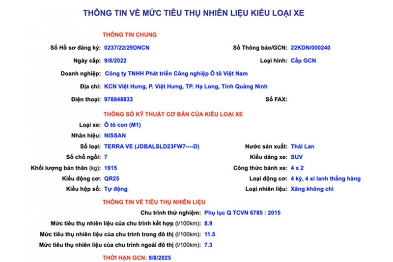 Trên Website của Cục Đăng kiểm, thông tin về tiêu thụ nhiên liệu của Nissan Terra 2023 mới được công bố. Theo đó, phiên bản có tên Terra VE (không giống bất cứ tên gọi phiên bản nào trước đây) sử dụng máy xăng 2.5L mã QR25 với hệ dẫn động một cầu có mức tiêu thụ nhiên liệu hỗn hợp trung bình là 8,9 lít/100 km. Ở đường trường và đô thị, xe tiêu thụ lần lượt 7,3 lít/100 km và 11,5 lít/100 km.