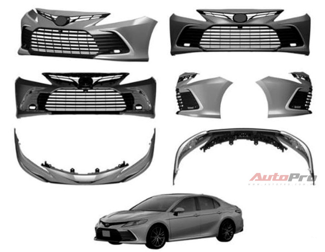 Có thể thấy lưới tản nhiệt của Camry mới lớn hơn trước, kéo dài sang 2 bên. Theo như hình ảnh đăng ký bản quyền thì phiên bản này dùng bộ vành 18 inch mới, phối 2 tông màu tương phản. Cụm đèn chiếu sáng vẫn giống hệt bản cũ.