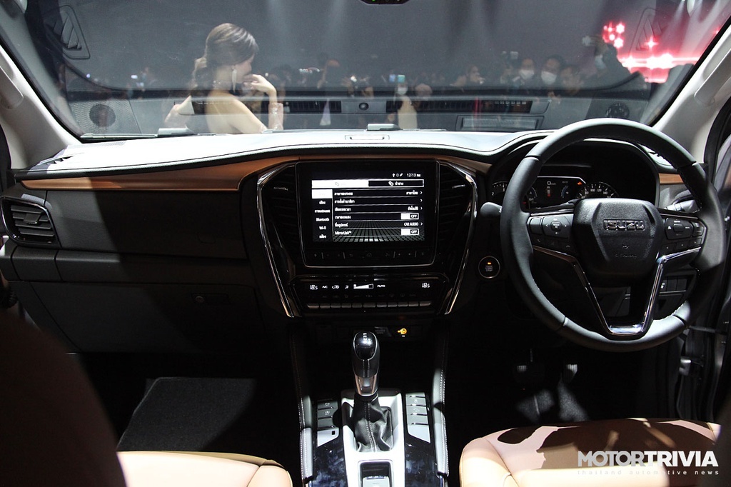 Bên trong, Isuzu MU-X khá hiện đại với màn hình thông tin giải trí 9 inch, hệ thống Isuzu Ultimate Entertainment tích hợp Apple CarPlay/Android Auto không dây, đèn nền nội thất, điều hòa không khí 2 vùng tự động, dàn âm thanh 8 loa. Ghế lái chỉnh điện 8 hướng, vô-lăng tích hợp lẫy chuyển số và nút chức năng, phanh tay điện tử, cốp sau đóng/mở điện. Chìa khóa thông minh trên MU-X 2021 có thể đề nổ động cơ từ xa và đóng/mở cốp.