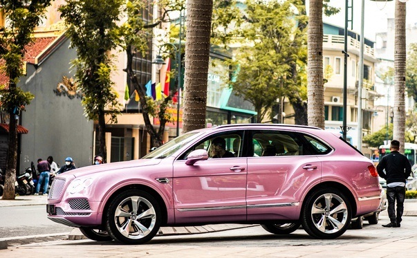 Khác với những phối màu mạnh mẽ thường thấy trên những chiếc SUV siêu sang, chiếc Bentley Bentayga xuất hiện tại Hà Nội hồi đầu tháng 2/2020 lại mang màu hồng nhạt nữ tính.