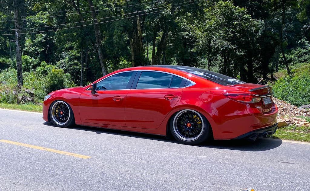 Hệ thống treo của xe hạ sát đất. Để làm được điều đó, chủ xe đã thay hoàn toàn hệ thống phuộc hơi (air suspension). Cách làm này giúp cho chiếc xe có thể vận hành bình thường trong điều kiện đường Việt Nam. Chỉ với một nút bấm, có thể điều chỉnh cho thân xe nâng lên độ cao bình thường, nhưng cũng có thể hạ gầm sát đất khi dừng lại. Ở mức thấp nhất, hệ thống phuộc khiến gầm xe hạ gần như không còn khoảng hở với mặt đất, cùng với các bánh xe với mép lốp trên giấu hẳn vào trong vè để kiến chiếc Mazda6 có "thế đứng" cực kỳ ấn tượng trên đường.