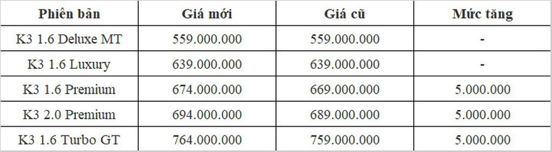 Loạt xe Kia K3, Seltos và Soluto tại Việt Nam bất ngờ tăng giá bán. Trước đó, Kia K3 mới tăng giá vào giữa tháng 2/2022. Ở lần tăng này, chỉ có 3 phiên bản cao cấp nhất được tăng thêm 5 triệu đồng, 2 phiên bản thấp nhất vẫn được giữ nguyên giá cũ.