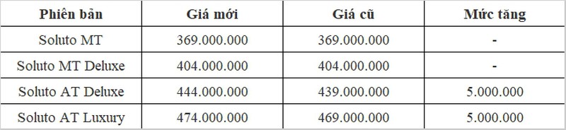 Trong khi đó, đây là một trong những lần hiếm mà Kia Soluto tăng giá bán kể từ khi ra mắt Việt Nam, hai phiên bản MT vẫn giữ nguyên giá bán còn bản cao cấp tăng 5 triệu đồng. Sau đơt điều chỉnh này, giá bán của Kia Soluto vẫn thuộc tầm thấp trong phân khúc sedan hạng B, vẫn có sức hút đối với những người dùng có nhu cầu mua xe để kinh doanh chạy dịch vụ.