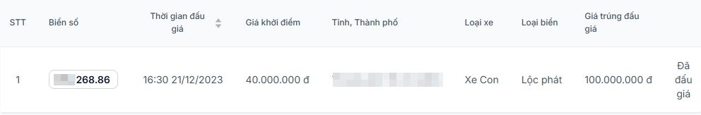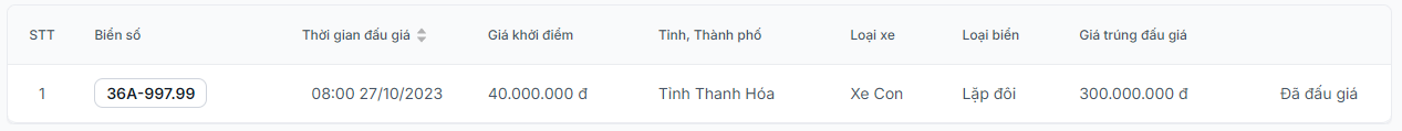 Khi tra cứu kết quả trên trang web đấu giá trực tuyến, thông tin cho thấy biển số 36A-997.77 đã được đấu thành công với số tiền 300 triệu đồng. Con số này hơn giá bán xe chưa kèm pin 60 triệu đồng, gần bằng giá bán xe đã kèm pin. Điều này thể hiện được giá trị của dãy số "tứ quý thần tài" này.