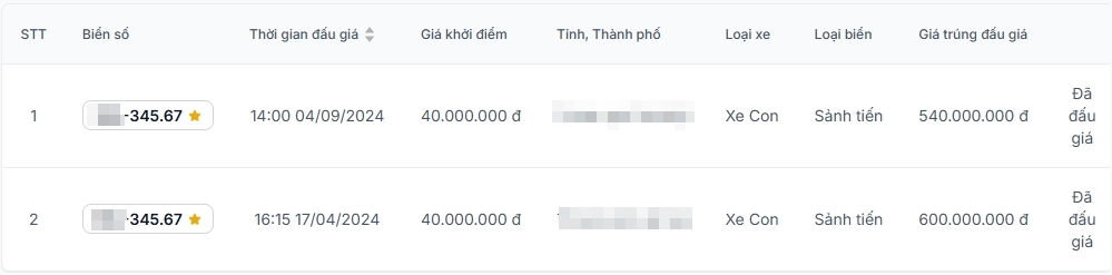 Do đó, khi một chiếc VinFast VF 3 được phát hiện treo tấm biển sảnh tiến "345.67", nhiều người không khỏi kinh ngạc bởi giá trị biển này rất cao. Tra cứu trong kho đấu giá trên website của đơn vị tổ chức, tấm biển treo trên chiếc VF 3 này đã trải qua hai lần đấu giá. Lần 1 đấu giá vào tháng 4/2024 với mức 600 triệu đồng. Lần 2 đấu giá vào tháng 9/2024 với mức 540 triệu đồng.