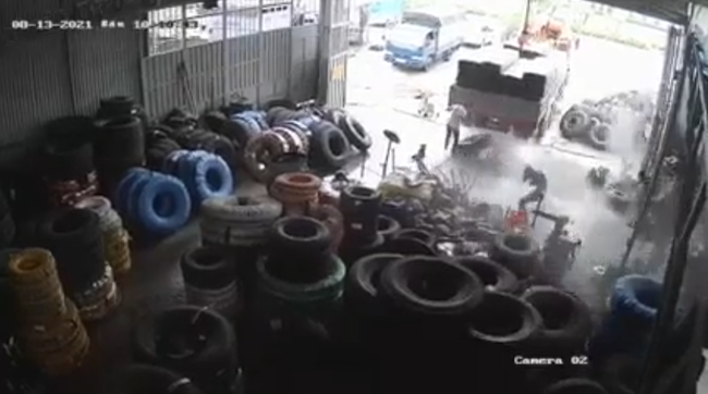 Toàn bộ sự việc được camera an ninh tại xưởng này ghi lại được. Theo đó, vào khoảng 10 giờ sáng ngày 13/8, khi các thợ sửa đang bơm lốp ô tô thì bất ngờ chiếc lốp đang bơm phát nổ kinh hoàng. Khói bốc lên mịt mù khiến cả xưởng sửa xe bị một phen thất kinh.