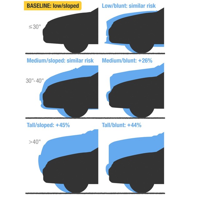 Một nghiên cứu của Viện Bảo hiểm An toàn Đường cao tốc Mỹ (IIHS) vào tháng 11/2023 chỉ ra rằng trên những chiếc ô tô có phần đầu tạo hình vuông vức và chiều cao nắp ca-pô hơn 1.020 mm, khả năng gây tử vong khi đâm phải người đi bộ cao hơn tới 44% so với xe có nắp ca-pô thấp và phần đầu tạo hình bo cong.