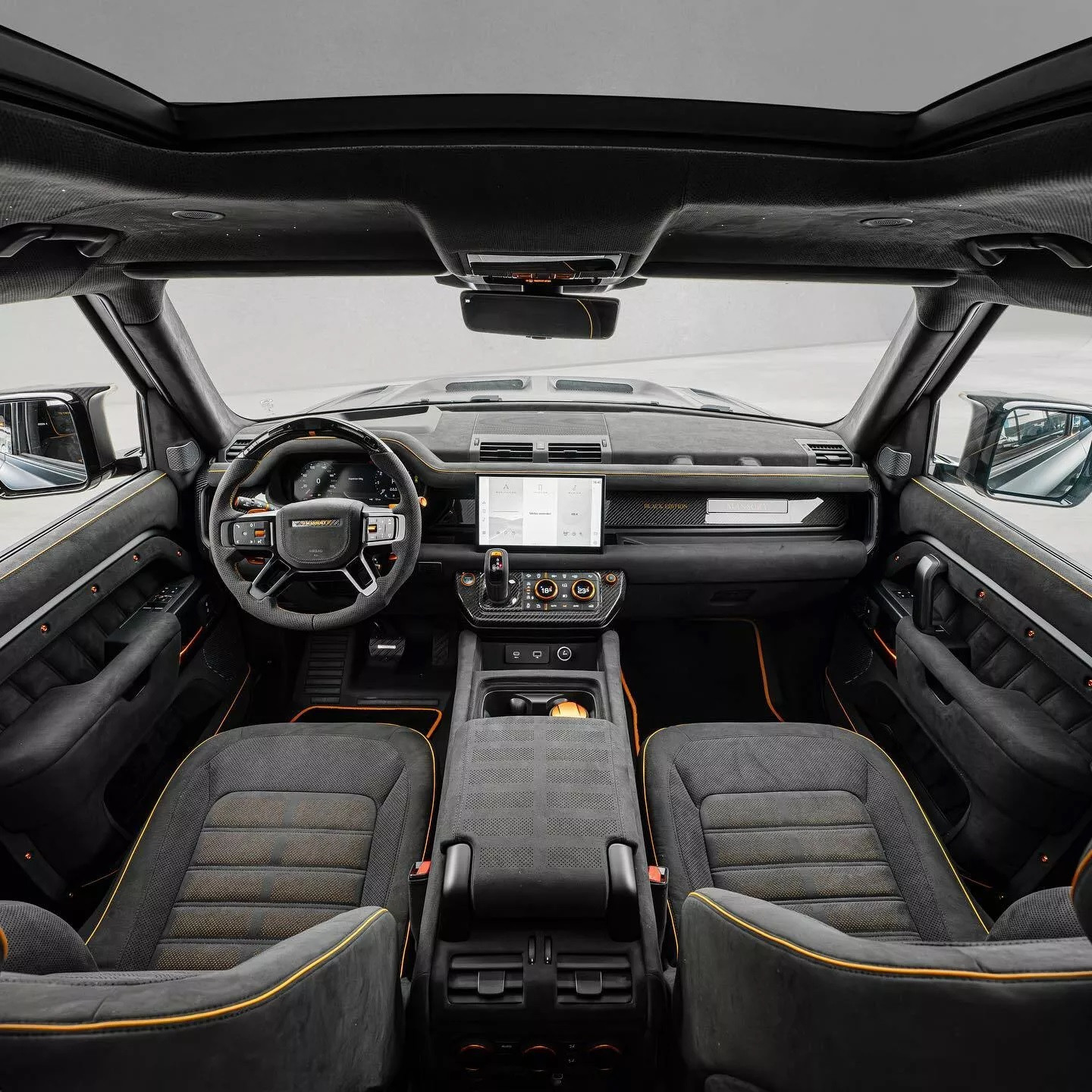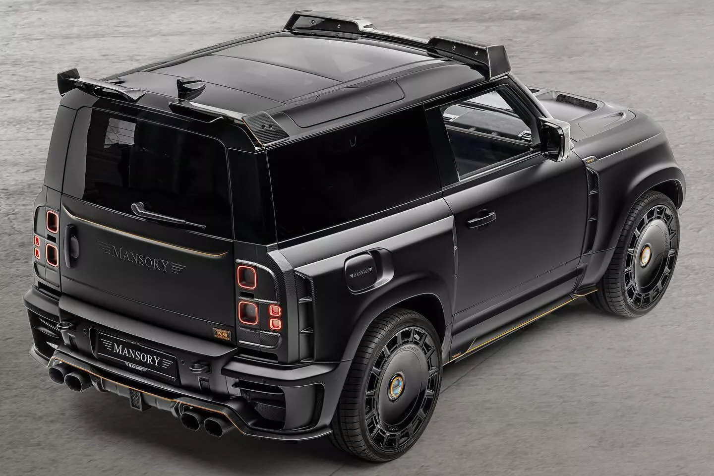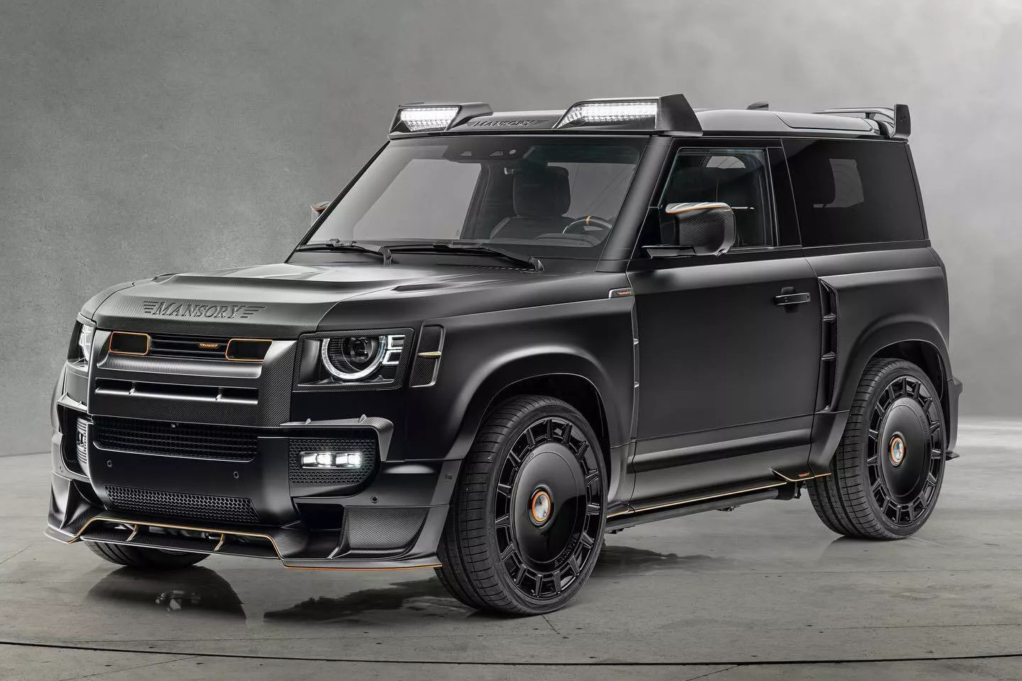 Chiếc Land Rover Defender nâng cấp gói độ của Mansory thuộc phiên bản V8 Black Edition, do đó hầu hết các chi tiết đều hoàn thiện với màu sơn đen bóng. Hãng độ nước Đức đã tô điểm cho phần nền màu đen bằng các đường viền màu cam.