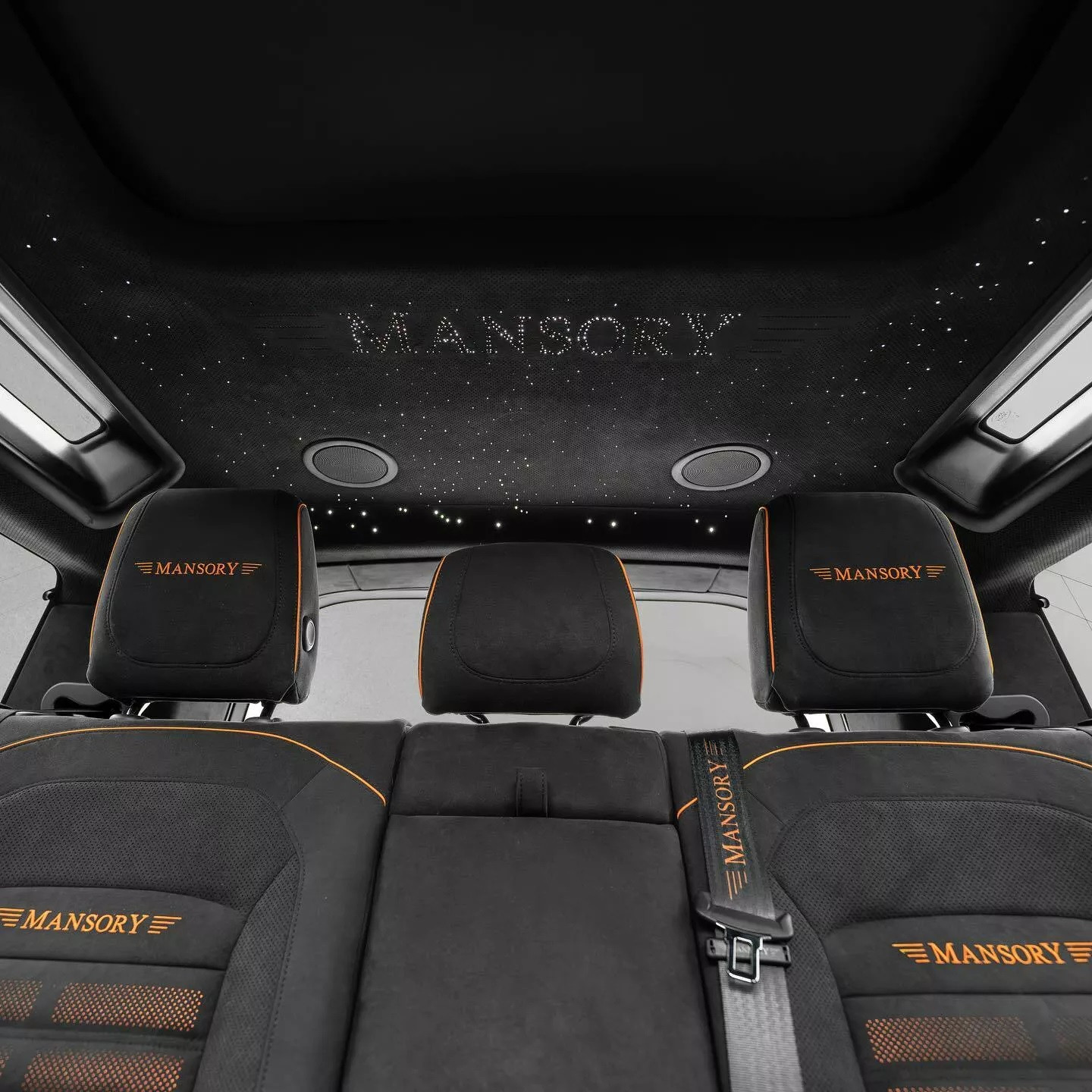 Tương tự, nội thất bọc lại vật liệu Alcantara màu đen ở ghế ngồi, táp-pi, táp-lô và trần xe. Đường chỉ khâu và đường viền sử dụng màu cam tương phản để tạo điểm nhấn cho không gian cabin. Trần xe được Mansory làm theo phong cách trần sao sang trọng của Rolls-Royce. Một số vị trí ốp sợi carbon thay cho crôm truyền thống.