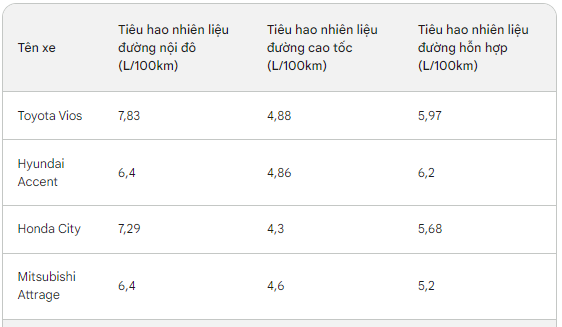 Nhìn vào bảng so sánh này có thể thấy, Mitsubishi Attrage có mức tiêu thụ nhiên liệu khá hấp dẫn so với các đối thủ trong cùng phân khúc.