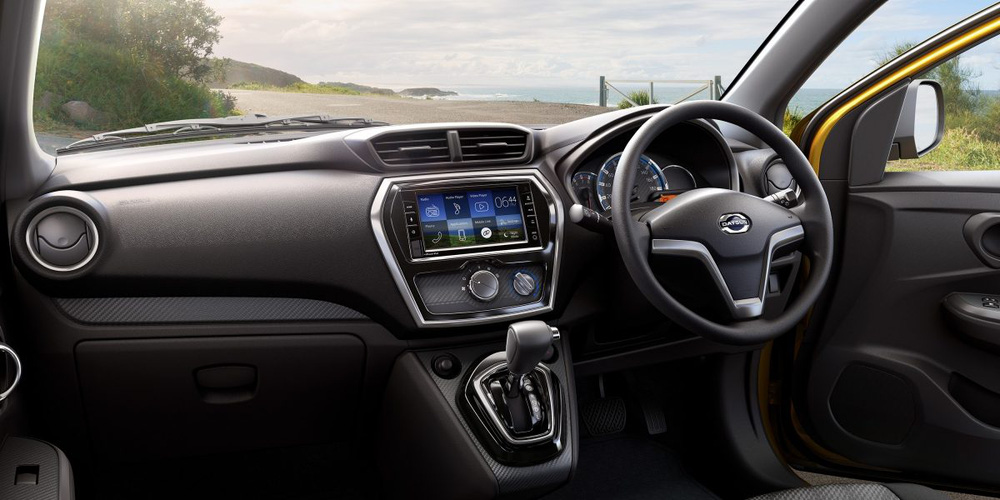 Datsun Cross 2021 có thiết kế nội thất đơn giản nhưng không kém phần hiện đại: mặt táp lô ốp nhựa đen bóng, vô lăng 3 chấu, màn hình giải trí đa phương tiện 6.75 inch tích hợp USB, Bluetooth và kết nối điện thoại thông minh. Điểm xuyết vào tổng thể chung là các đường viền sơn bạc quanh các chi tiết tạo nên điểm nhấn cho không gian nội thất.