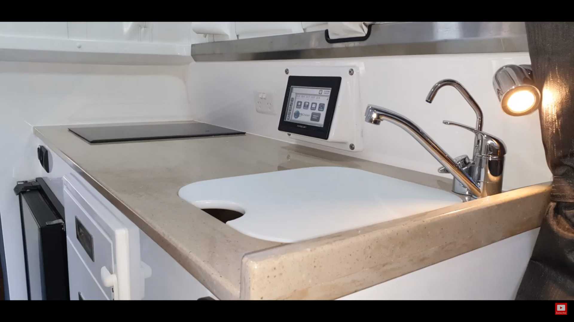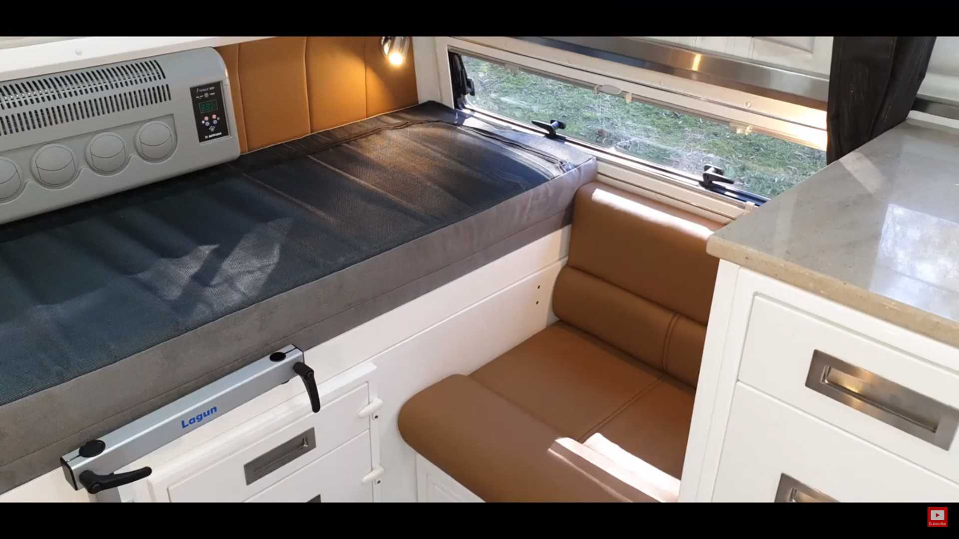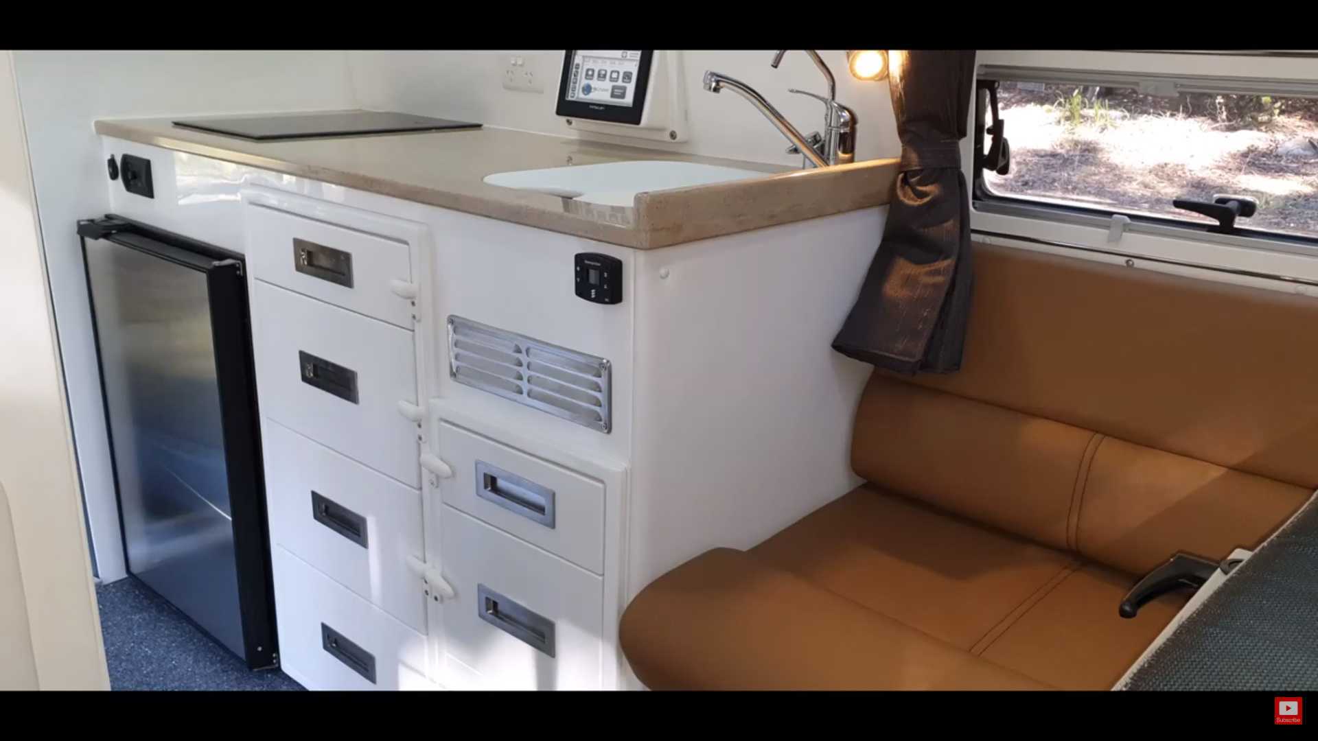 Chẳng hạn, bên dưới những tấm ốp thân vỏ màu trắng là một phòng ăn nhỏ có thể tận dụng làm chỗ ngủ. Bên trong xe cũng có một nhà bếp hoàn chỉnh kèm tủ lạnh. Thậm chí, có cả một phòng tắm với nhà vệ sinh và vòi hoa sen.