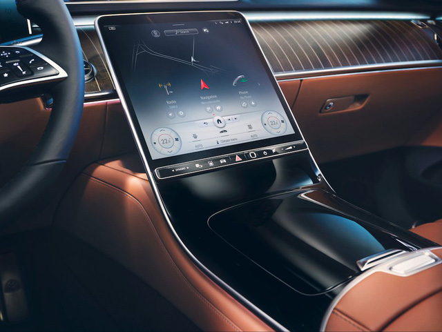 Khoang lái phía trước S 680 trông cũng giống các bản S-Class khác. Vô-lăng 3 chấu hàng thửa của Maybach. Màn hình giải trí trung tâm kích thước 12,8 inch.