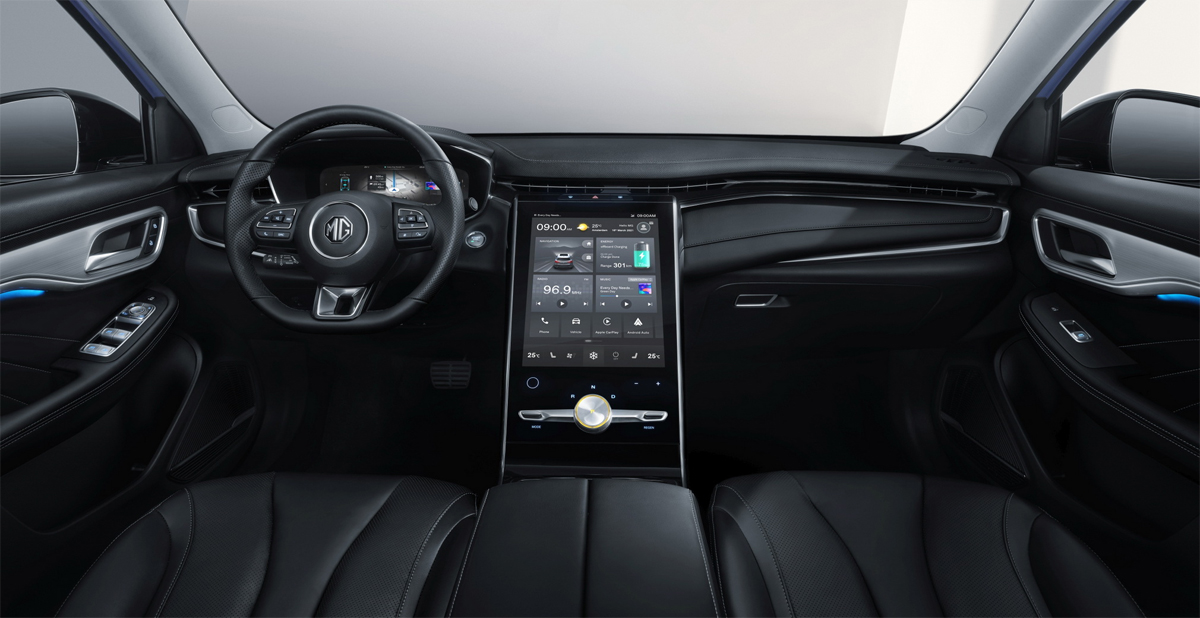 Màn hình cảm ứng 19,4 inch dành cho hệ thống thông tin giải trí và điều khiển điều hòa, núm xoay chọn số nằm phía dưới. Đồng hồ kỹ thuật số 12,3 inch, đèn trang trí nội thất và ghế bọc da.