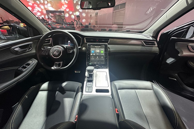 Bên trong MG RX5 là không gian nội thất 5 chỗ ngồi với ghế bọc da, vô lăng vát đáy thể thao, tích hợp lẫy chuyển số, bảng đồng hồ kỹ thuật số 12,3 inch, màn hình cảm ứng trung tâm 14,1 inch nằm dọc, cửa sổ trời, phanh tay điện tử, điều hòa tự động 2 vùng, hệ thống âm thanh 6 loa và sạc điện thoại không dây.