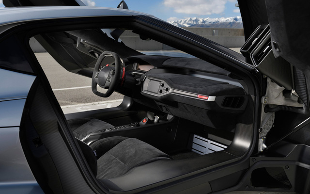 Có nhiều điểm khá thú vị khiến Ford GT khác biệt so với nhiều siêu xe thương mại khác. Bộ khung xe được làm từ sợi carbon và nhôm. Vật liệu bọc nội thất chủ yếu là Alcantara. Thiết kế khoang lái trông khá đơn điệu, giống như phi cơ, hướng chủ yếu tới trải nghiệm vận hành. Ghế xe không thể tùy chỉnh mà người lái phải chỉnh pedal sao cho phù hợp với chân mình.