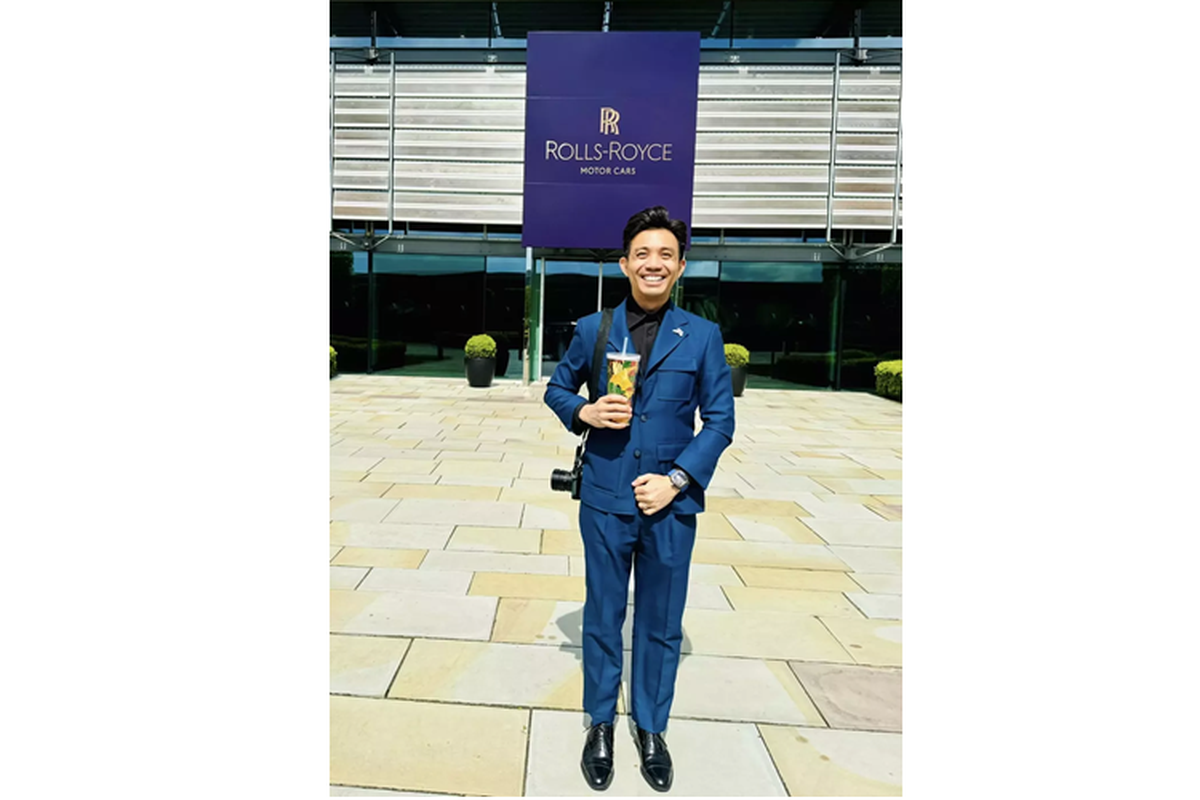 Có mặt tại Rolls-Royce Motor Cars ở London, Minh Nhựa diện bộ vest màu xanh thẩm cùng với đó là sự háo hức diện kiến chiếc xe siêu sang Rolls-Royce Spectre chạy điện mà mình đặt mua đã gần 1 năm qua.