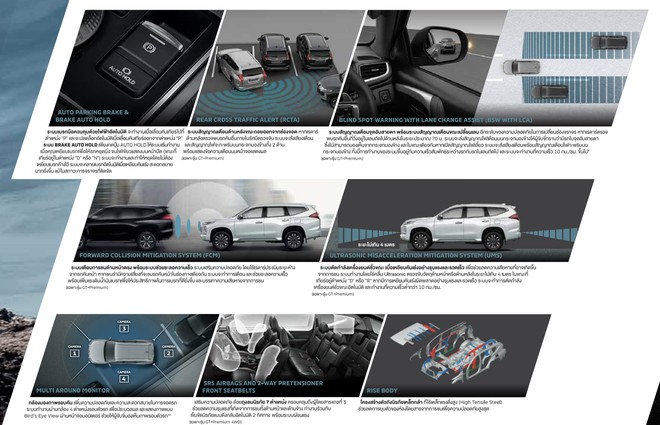 Điểm nổi bật nhất trên bản GT-Premium mới này là công nghệ an toàn. Xe có khá nhiều tính năng an toàn chủ động tiên tiến, bao gồm cảnh báo điểm mù, báo phương tiện cắt ngang phía sau, hỗ trợ chuyển làn, chống tăng tốc đột ngột, hỗ trợ phanh tự động khẩn cấp khi phát hiện va chạm sớm và ga tự động thích ứng khoảng cách. Camera quan sát toàn cảnh cũng là trang bị đáng chú ý. So với đối thủ Toyota Fortuner với bản cao cấp nhất Legender 2.8AT vừa ra mắt thì Mitsubishi Pajero Sport GT-Premium có nhiều trang bị an toàn hiện đại hơn.