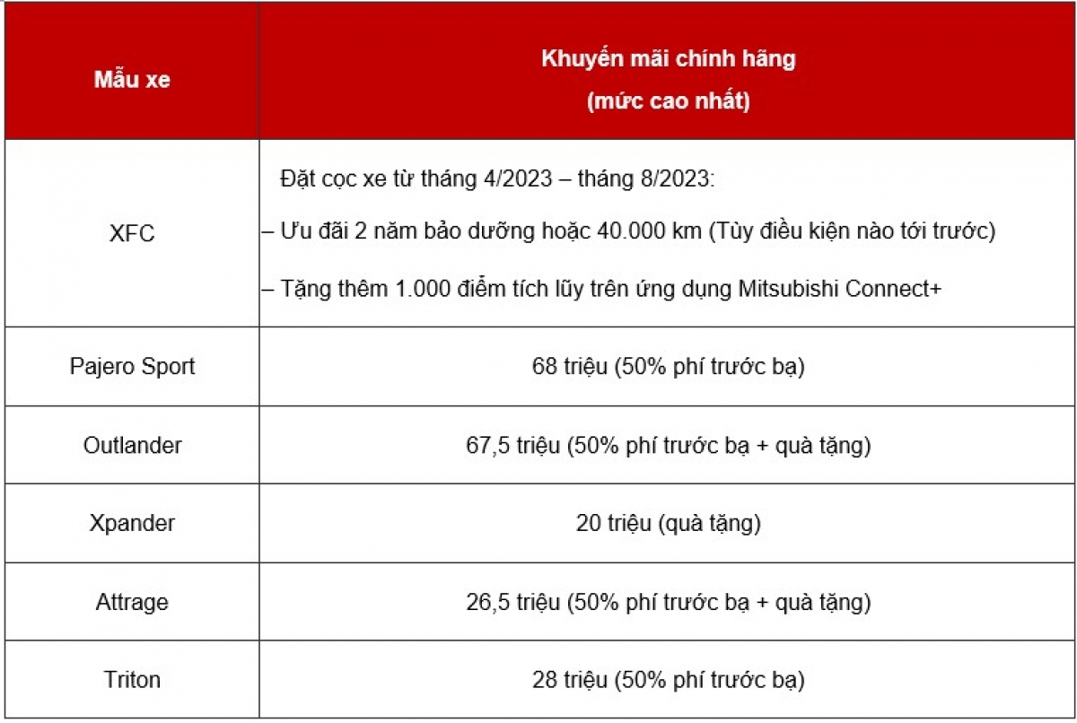 Ngoài ra, đặc quyền dành cho khách hàng đặt cọc 10 triệu đồng đối với mẫu xe XFC concept từ 1/4/2023 đến 31/8/2023 bao gồm 2 năm bảo dưỡng hoặc 40.000 km và tặng thêm 1.000 điểm tích lũy trên ứng dụng Mitsubishi Connect+.