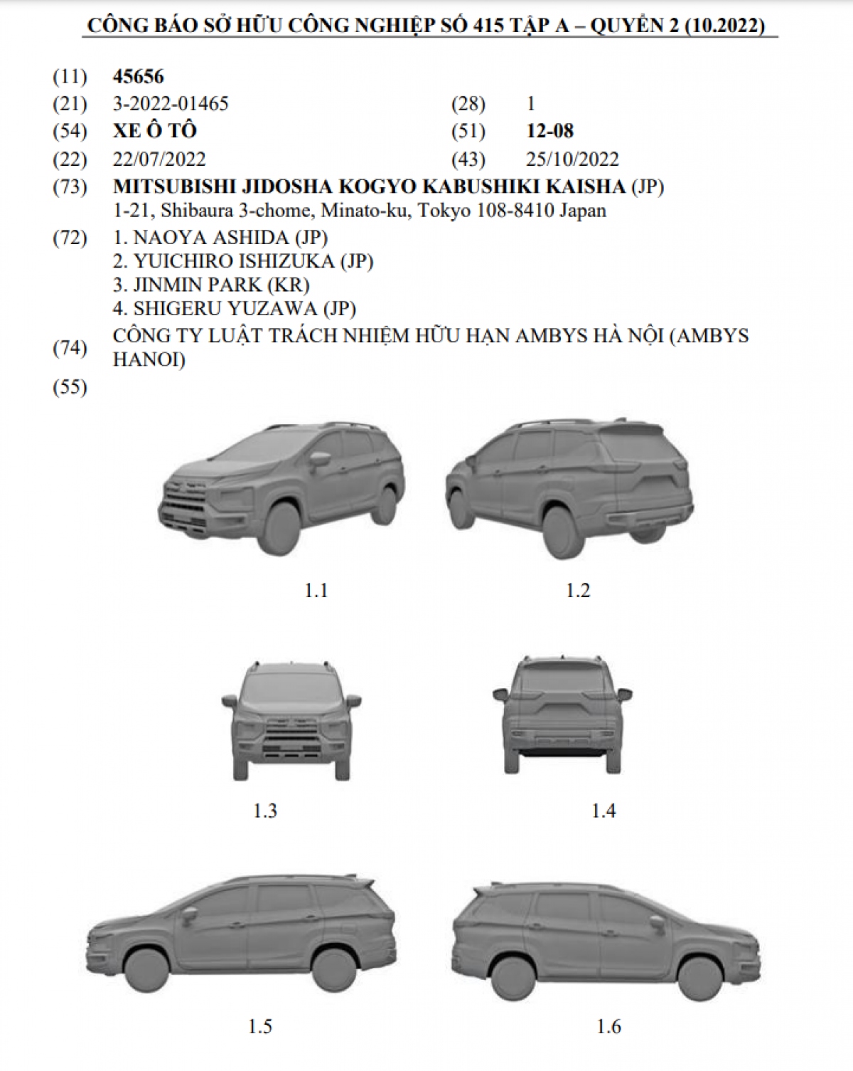 Phiên bản MPV lai Crossover của Mitsubishi Xpander mới được công bố đăng ký kiểu dáng công nghiệp tại Việt Nam. Theo thông tin được đăng tải trên trang thông tin của Cục Sở hữu trí tuệ Việt Nam, mẫu thiết kế này đã được nộp đơn đăng ký từ ngày 22/7/2022 và mới thông báo vào ngày 25/10.
