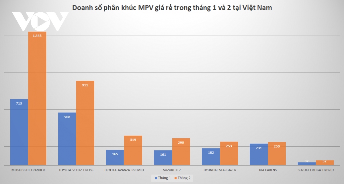 Với sự tăng trưởng trở lại của thị trường ô tô Việt Nam, các mẫu xe MPV cũng được hưởng lợi khi được tiêu thụ nhiều hơn trong tháng 2/2023. Trong đó, Mitsubishi Xpander trở thành một trong những mẫu xe tăng mạnh doanh số nhất với 1.443 chiếc bán ra, cao hơn 100% so với tháng 1 trước đó.