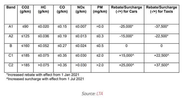 Quan điểm của chính phủ Singapore là cần phải kiểm soát lượng ô tô. Có đến 6 yếu tố quyết định giá của một chiếc ô tô mới ở Singapore đó là 1/Giá thị trường mở (OMV), 2/Phí đăng ký bổ sung (AFR), 3/Thuế tiêu thụ đặc biệt và thuế hàng hoá dịch vụ (GST), 4/Giấy chứng nhận quyền sở hữu xe (COE), 5/Phụ phí của chương trình phát thải xe cộ (VES) và 6/Lợi nhuận của các đại lý địa phương.