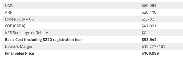 Để tính ra lợi nhuận của đại lý, chúng ta chỉ cần cộng các khoản gồm OMV, AFR, thuế tiêu thụ đặc biệt, GST, VES và COE sẽ ra một thứ gọi là "giá cơ bản". Sau đó lấy giá thực tế bán ra thị trường trừ đi giá cơ bản sẽ ra lợi nhuận của đại lý. Con số sẽ khác biệt tuỳ vào chính sách của từng đại lý.