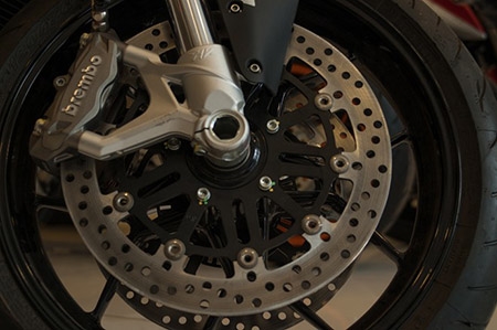 Trang bị an toàn phía trước là hệ phanh đĩa đôi, đường kính 320 mm, đi cùng kẹp phanh Brembo 4 pít tông. Giảm xóc trước bán chủ động hành trình 43 mm, do Sachs sản xuất. |
