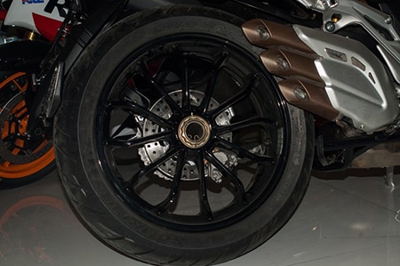 MV Agusta Turismo Veloce 800 Lusso Edition sử dụng vành xe hợp kim, kích thước 17 inch. Đĩa phanh sau đường kính 220 mm, đi cùng kẹp phanh Brembo 2 pít tông. |