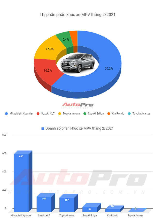 Kết quả doanh số phân khúc MPV tháng 2/2021 không có gì bất ngờ khi Mitsubishi Xpander tiếp tục dẫn đầu và bỏ xa các đối thủ khác. Theo thống kê của VAMA, với doanh số bán hàng 630 xe trong tháng vừa qua, thị phần Xpander (bao gồm cả Xpander Cross) chiếm hơn 60% phân khúc. Con số gần 40% còn lại chia cho 5 đối thủ khác là XL7, Innova, Ertiga, Rondo và Avanza.