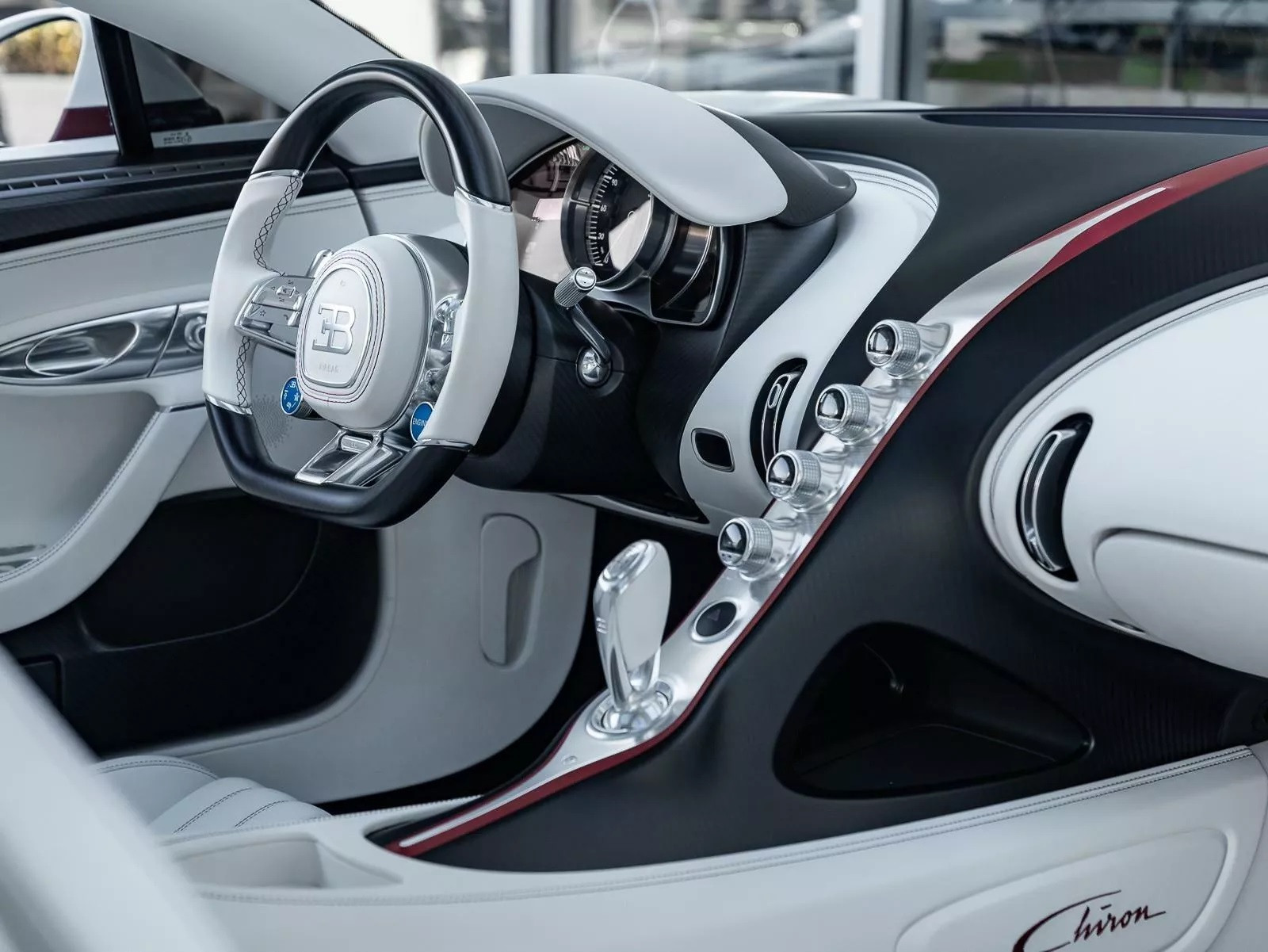 Tương tự, không gian nội thất cũng được bọc da màu trắng, điểm xuyết bằng đường chỉ khâu và các điểm nhấn màu đỏ mận như logo trên tựa đầu, huy hiệu Chiron, đường viền trên táp-lô, dây an toàn. Do ít sử dụng, nhìn chung khoang lái của xe còn rất mới.