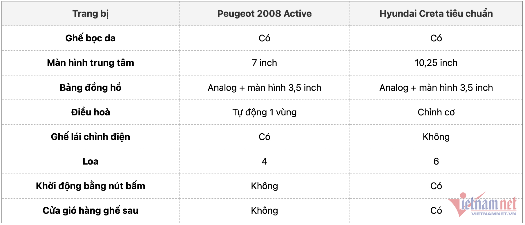 Hyundai Creta tiêu chuẩn có màn hình trung tâm 10,25 inch, điều hòa chỉnh cơ, 6 loa, khởi động từ xa và có cửa gió hàng ghế sau. Trong khi đó, Peugeot 2008 Active trang bị màn hình 7 inch, điều hòa tự động 1 vùng, 4 loa, ghế lái chỉnh điện nhưng không có khởi động bằng nút bấm và cửa gió hàng ghế sau.