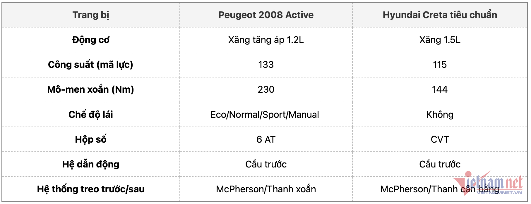 Về khả năng vận hành, Peugeot 2008 Active trang bị động cơ xăng tăng áp 1.2L, công suất mạnh hơn 18 mã lực và 86Nm so với Hyundai Creta tiêu chuẩn khi sử dụng động cơ xăng 1.5L.