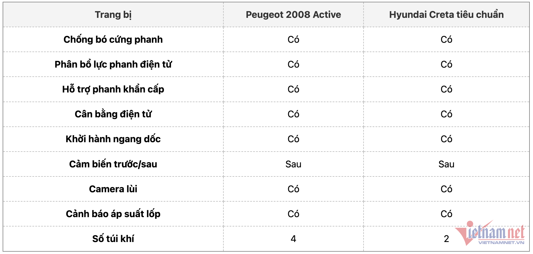 Ở khía cạnh trang bị an toàn, cả hai mẫu xe này chỉ được trang bị những hệ thống an toàn cơ bản nhưng Peugeot 2008 bản Active có tới 4 túi khí, nhiều hơn so với Hyundai Creta tiêu chuẩn (2 túi khí).