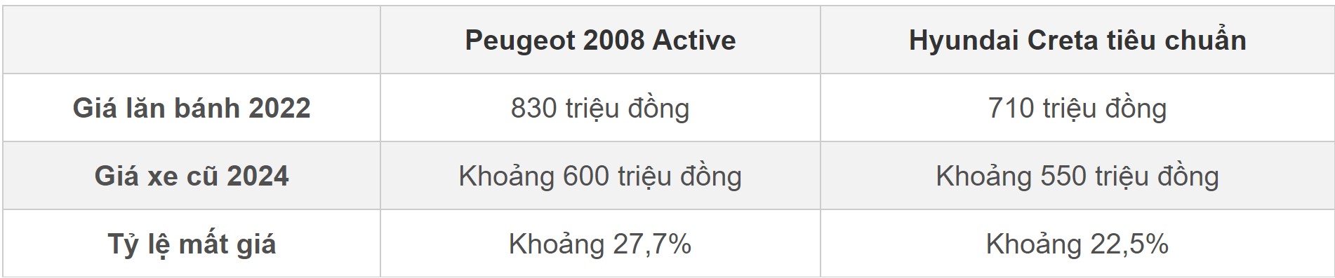 Peugeot 2008 bản Active không chỉ giá cao hơn mà còn mất giá nhiều hơn so với Hyundai Creta bản tiêu chuẩn.
