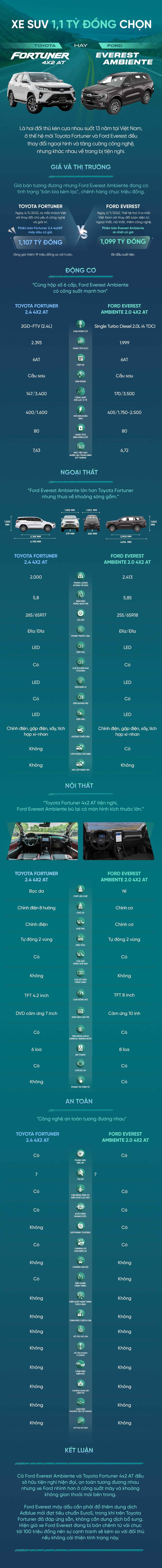 Là hai đối thủ kèn cựa nhau suốt 13 năm tại Việt Nam, ở thế hệ mới Toyota Fortuner và Ford Everest đều thay đổi ngoại hình và tăng cường công nghệ, nhưng khác nhau về trang bị tiện nghi.