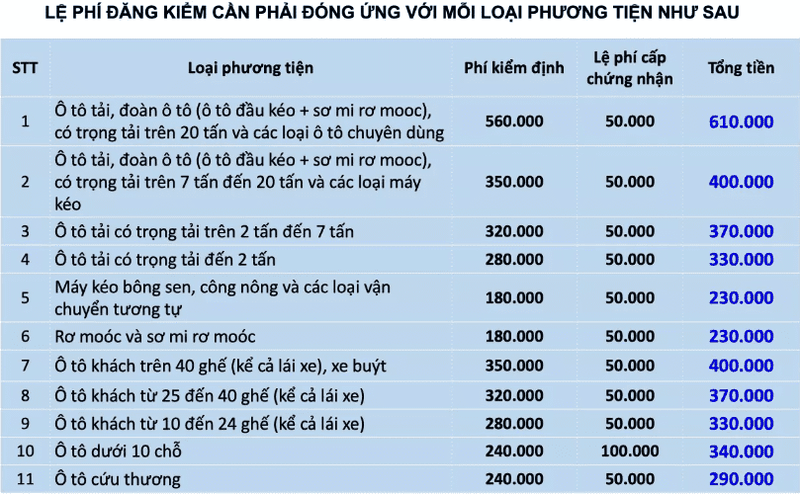 Như vậy, chủ xe tải có khối lượng hàng hóa chuyên chở cho phép hơn 20 tấn, xe đầu kéo có khối lượng kéo theo trên 20 tấn sẽ phải đóng mức giá dịch vụ kiểm định mới là 570 nghìn đồng. Cộng thêm lệ phí cấp giấy chứng nhận thì nhóm xe này phải nộp tổng cộng 620.000 đồng.