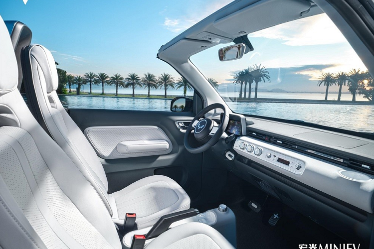 Bên trong Wuling Hongguang Mini EV Cabrio 2023 là không gian nội thất 2 chỗ ngồi. So với phiên bản mui cứng vốn có 4 chỗ, mẫu xe này ít chỗ ngồi hơn để lấy không gian cất mui mềm khi mở ra. Ngoài ra, phía sau 2 ghế còn có thanh bảo vệ hành khách trong trường hợp xe bị lật. Đây vốn là trang bị không thể thiếu của xe mui trần.